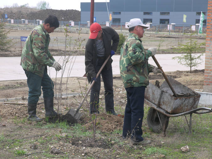 圖片新聞:虎林北大荒米業廠區環境特殊,離鐵路沿線只有50米,垃圾較多,為創造良好的廠區環境,他們組織各科室人員對廠區院內垃圾死角進行全面清理,清理白色垃圾、清掃枯葉垃圾,美化廠區環境。利用閑置空地植栽樹木,目前已有丁香花100余株,果樹500余株。 圖為員工們正在栽植樹木。