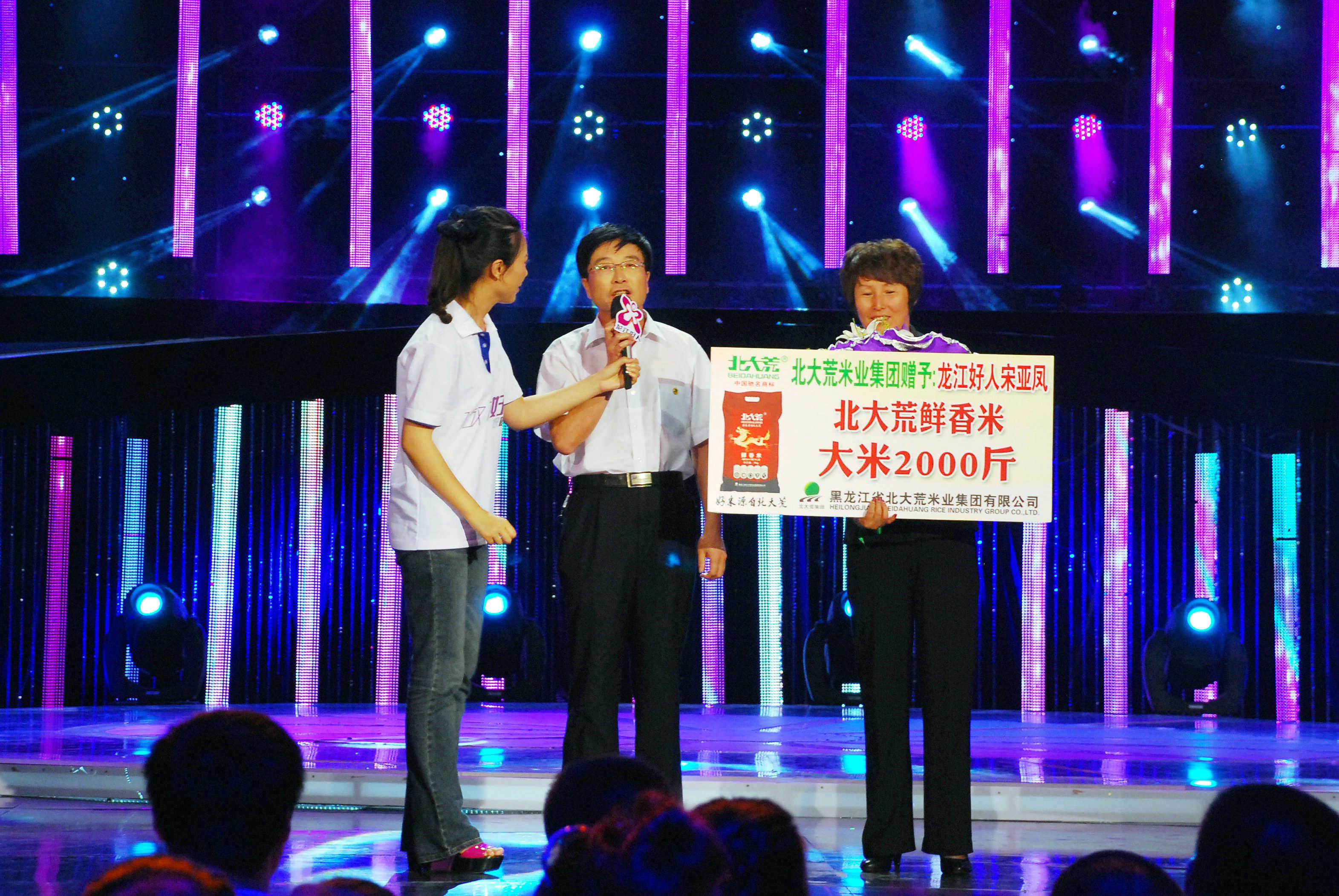 圖:8月1日,在首屆黑龍江省“十大好人”頒獎盛典上,北大荒米業集團捐助“好人”宋亞鳳吃上了“好米”。