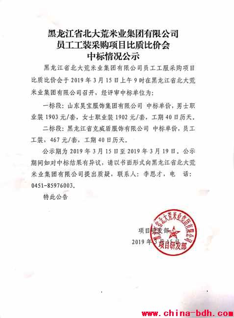 北大荒米業員工工裝采購項目比質比價會中標情況公示