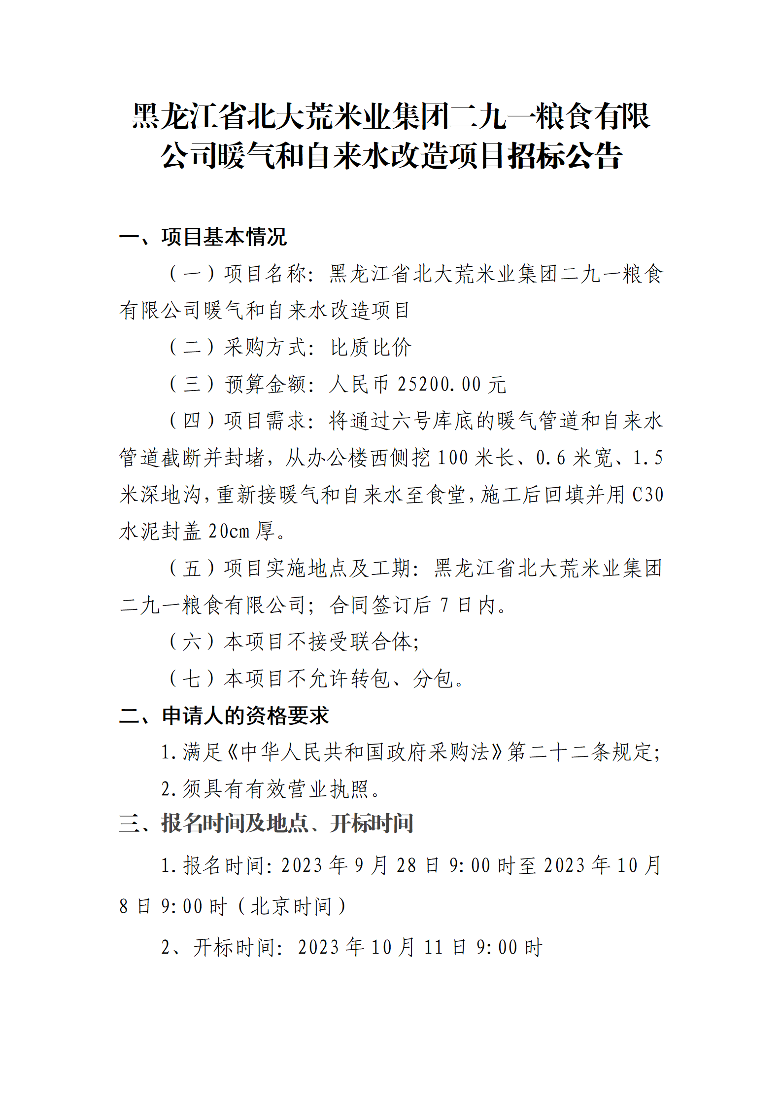 黑龍江省北大荒米業集團二九一糧食有限公司暖氣和自來水改造項目招標公告