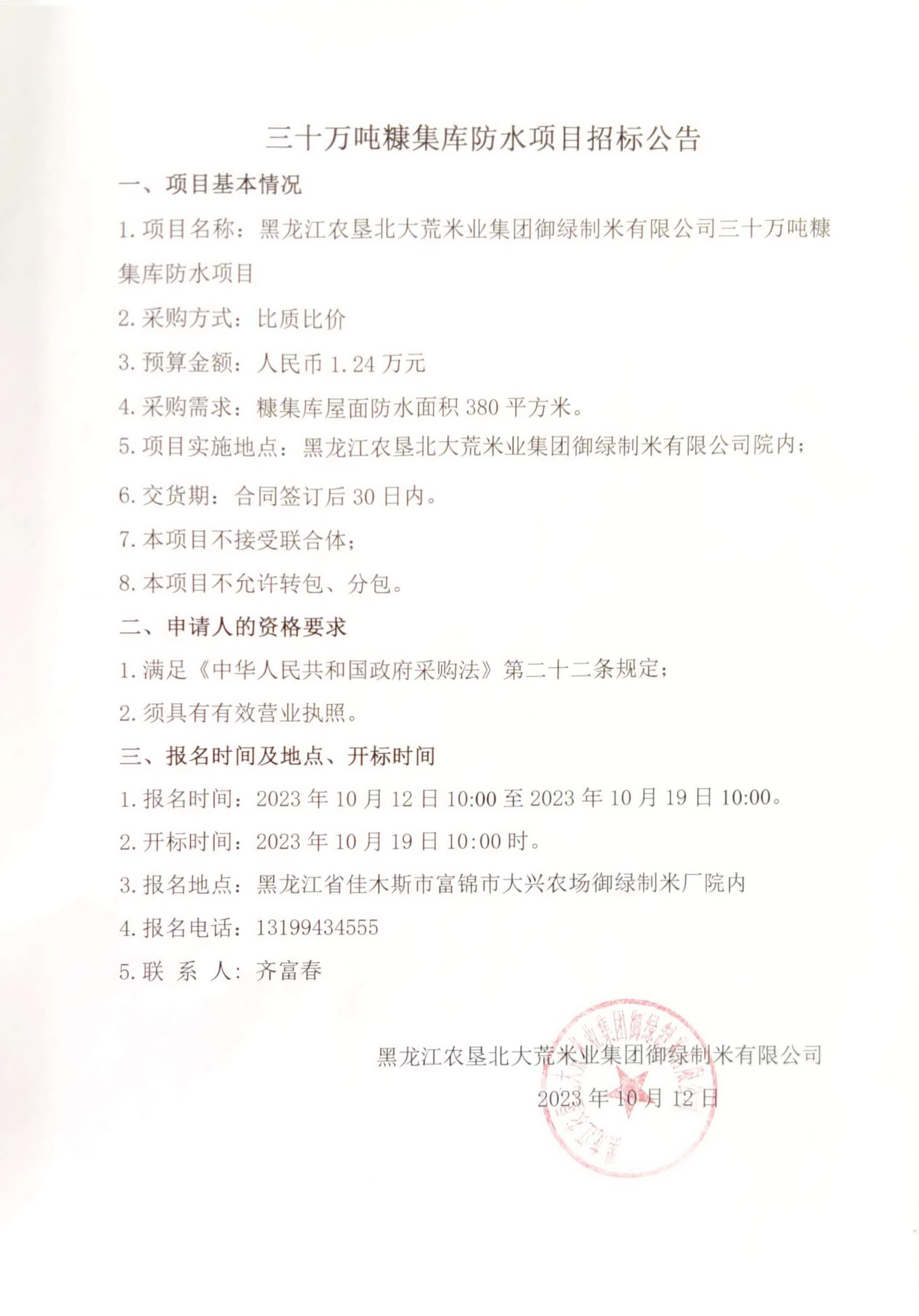 黑龍江農(nóng)墾北大荒米業(yè)集團御綠制米有限公司三十萬噸糠集庫防水項目招標公告
