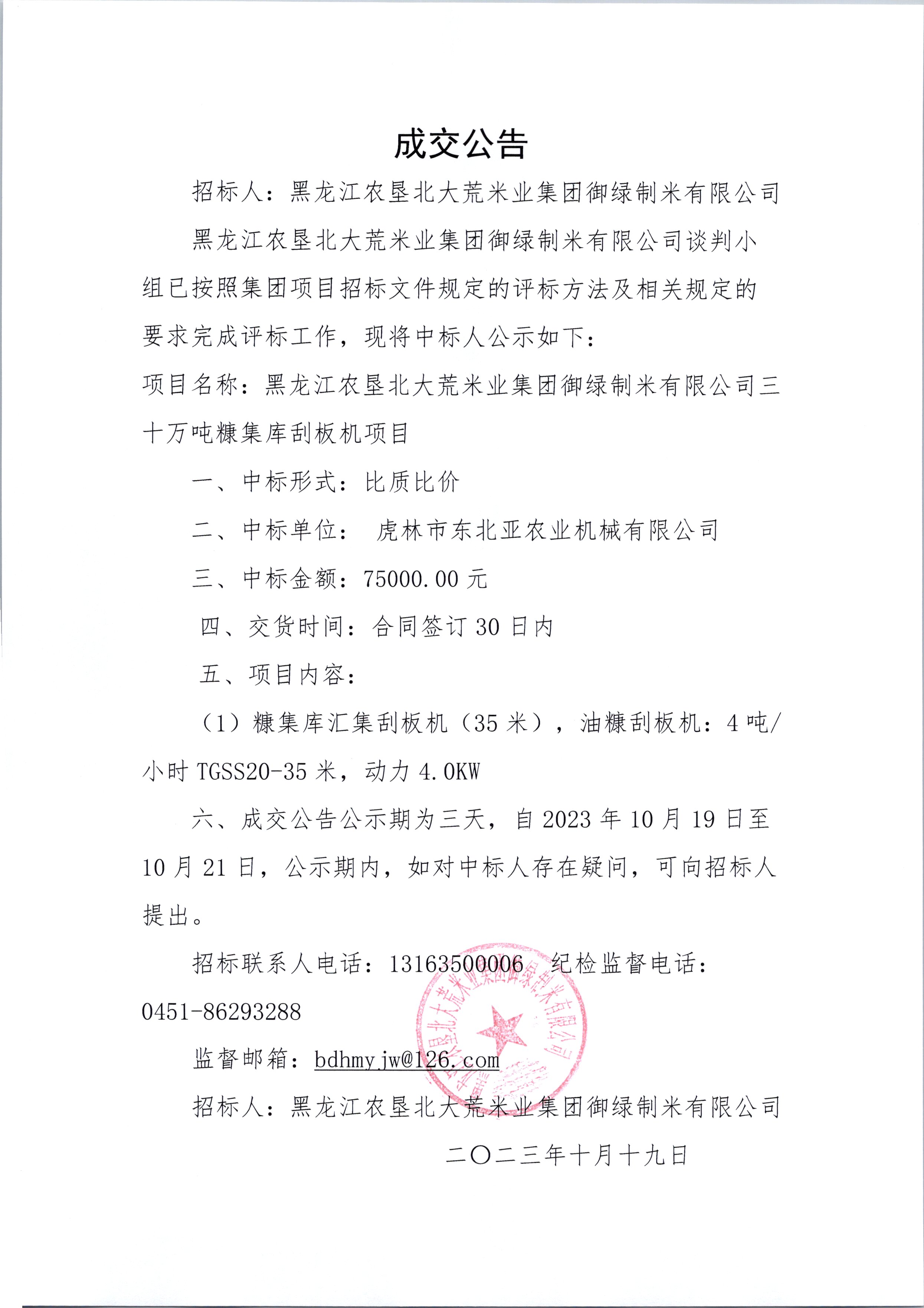黑龍江農墾北大荒集團御綠制米有限公司三十萬噸糠集庫刮板機項目成交公告
