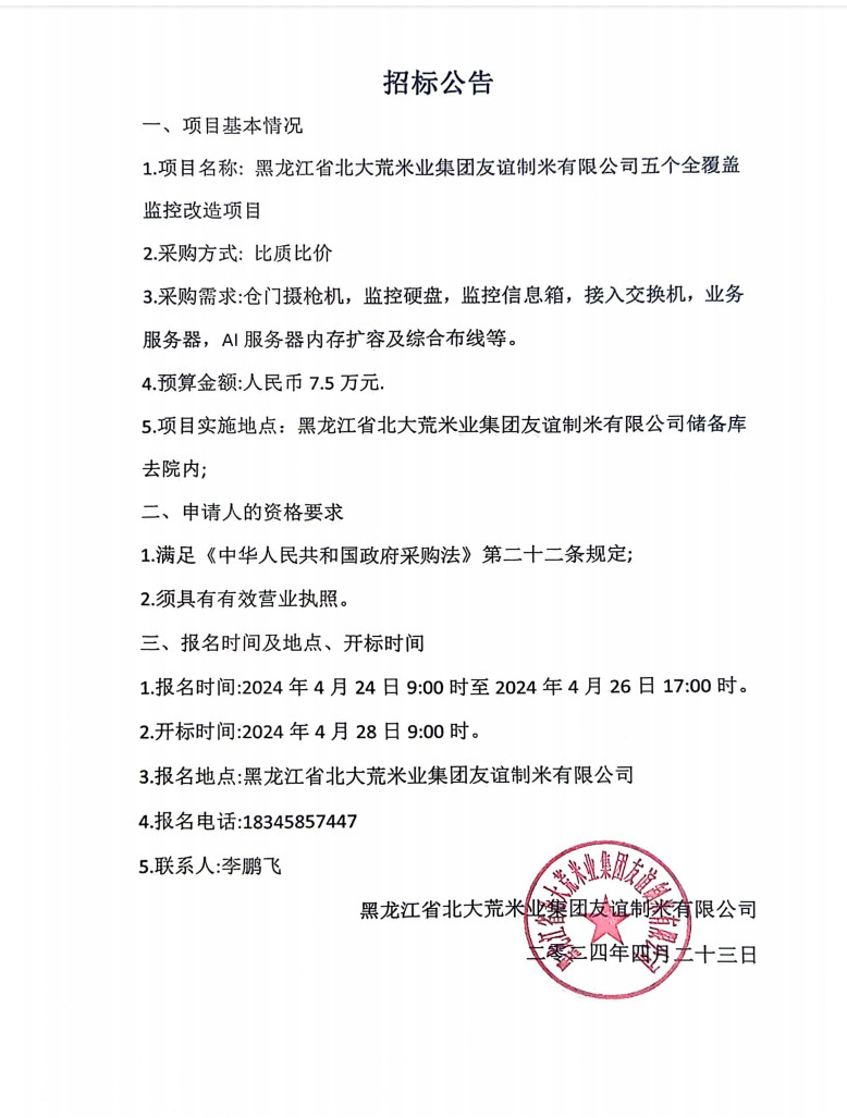 北大荒米業友誼公司五個全覆蓋監控改造項目招標公告