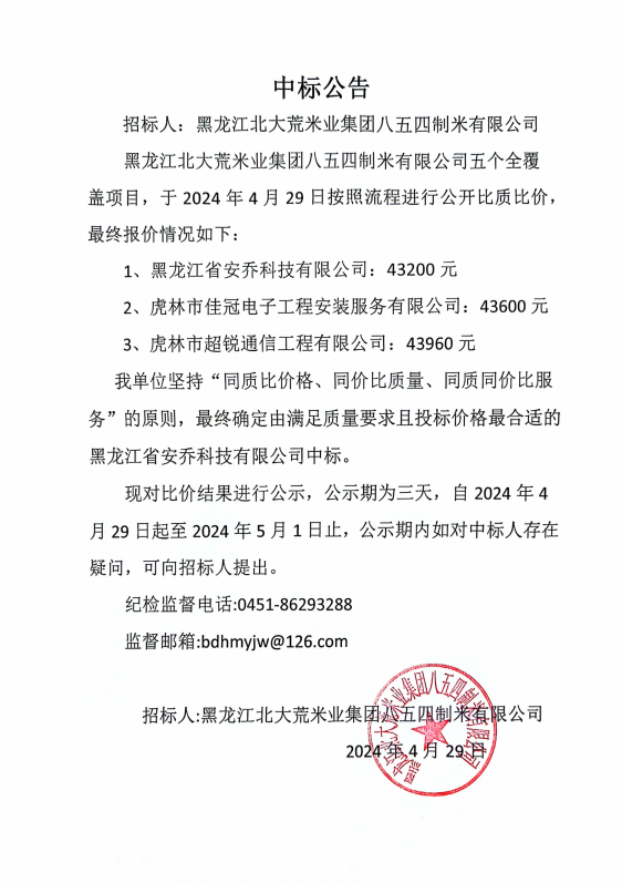 北大荒米業(yè)854制米公司五個(gè)覆蓋安裝采購(gòu)項(xiàng)目中標(biāo)公告