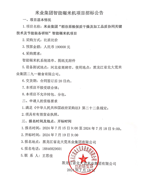 米業集團“稻谷原糧保質干燥及加工品質協同關鍵技術及節能裝備研制”智能碾米機項目招標公告