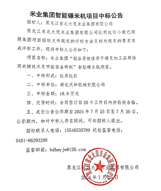 米業(yè)集團“稻谷原糧保質(zhì)干燥及加工品質(zhì)協(xié)同關(guān)鍵技術(shù)及節(jié)能裝備研制”智能碾米機項目中標公告