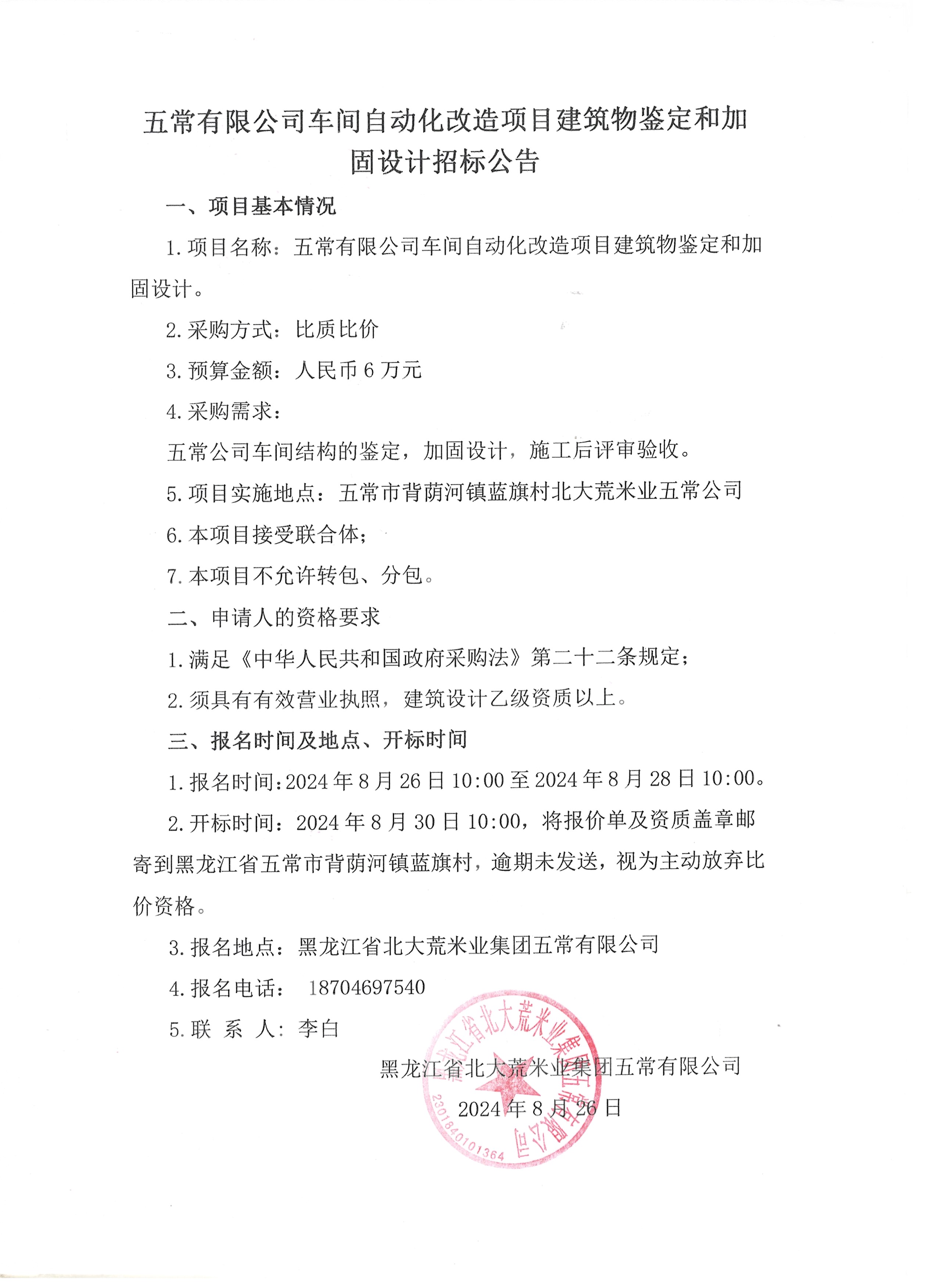 五常有限公司車間自動化改造項目建筑物鑒定和加固設計招標公告
