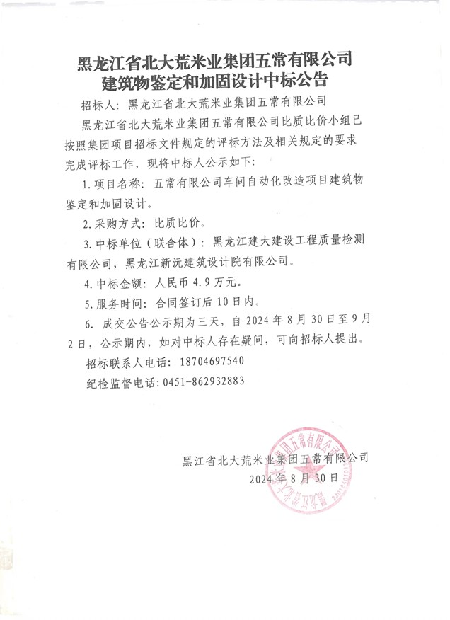 北大荒米業五常公司建筑物鑒定和加固設計中標公告