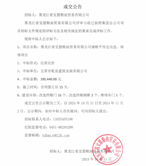黑龍江省寶盟糧油貿易有限公司平房倉改造維修項目中標公告