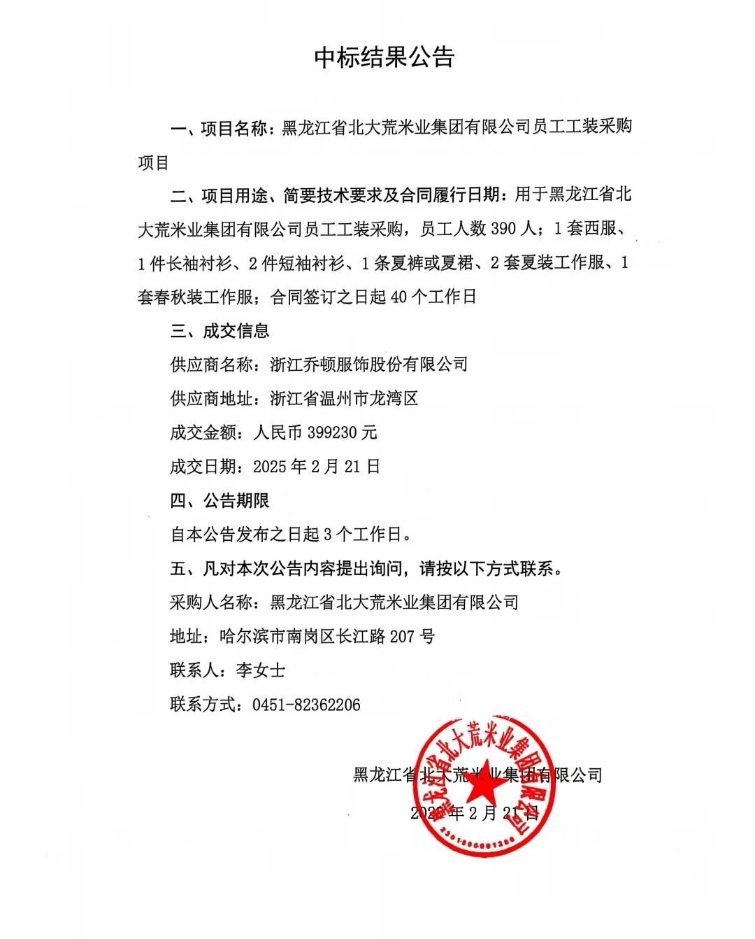 北大荒米業員工工裝采購中標公告