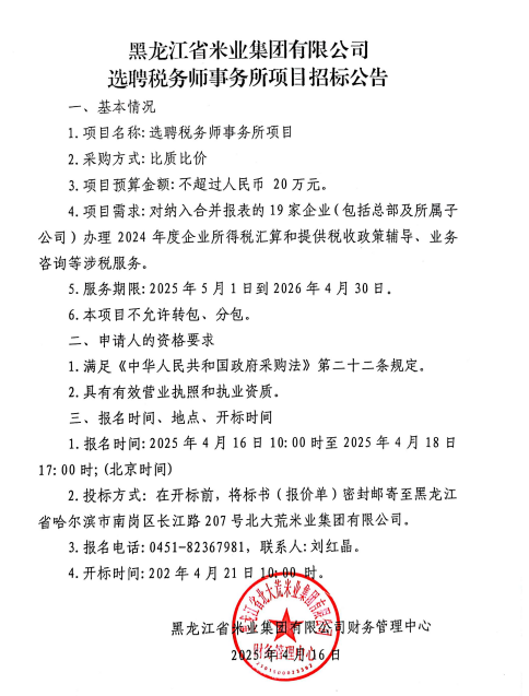 黑龍江省米業(yè)集團(tuán)有限公司選聘稅務(wù)師事務(wù)所項(xiàng)目招標(biāo)公告