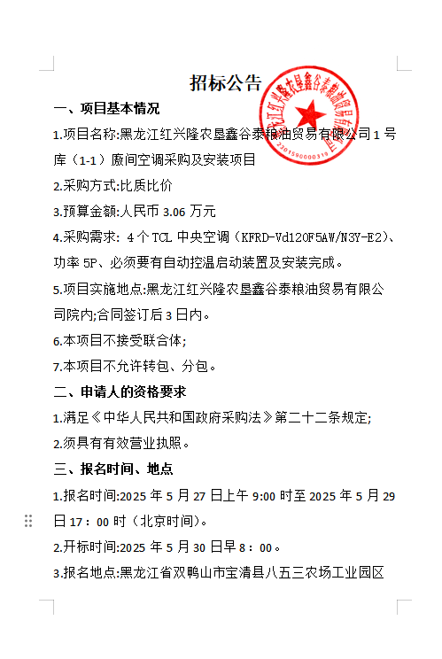 黑龍江紅興隆農墾鑫谷泰糧油貿易有限公司1號庫空調采購及安裝項目招標公告