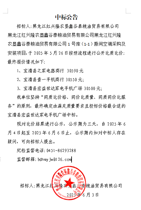 黑龍江紅興隆農(nóng)墾鑫谷泰糧油貿(mào)易有限公司1號庫空調(diào)采購及安裝項(xiàng)目中標(biāo)公告