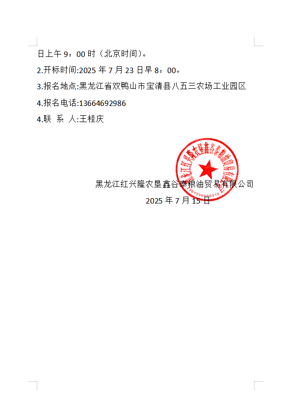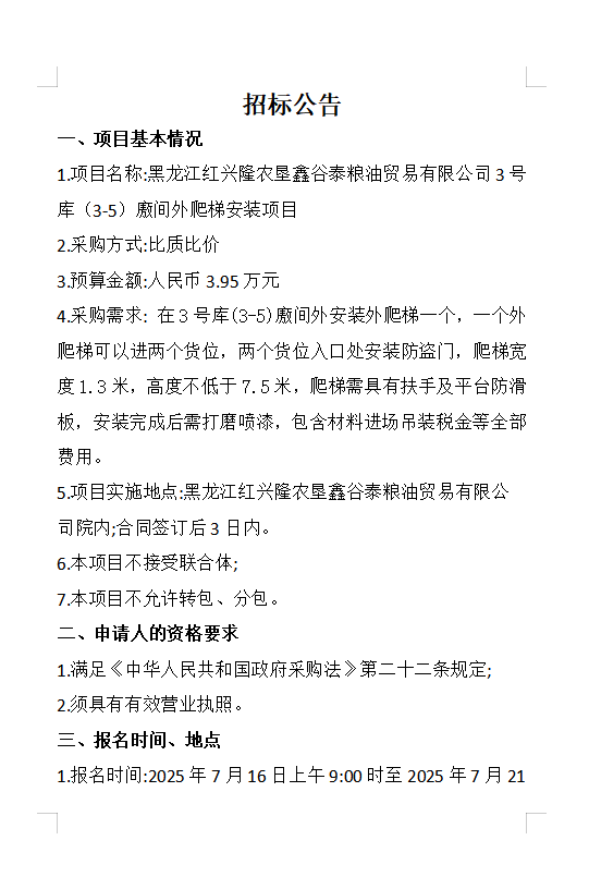 黑龍江紅興隆農(nóng)墾鑫谷泰公司國(guó)儲(chǔ)糧3號(hào)庫(kù)廒間外爬梯安裝項(xiàng)目招標(biāo)公告