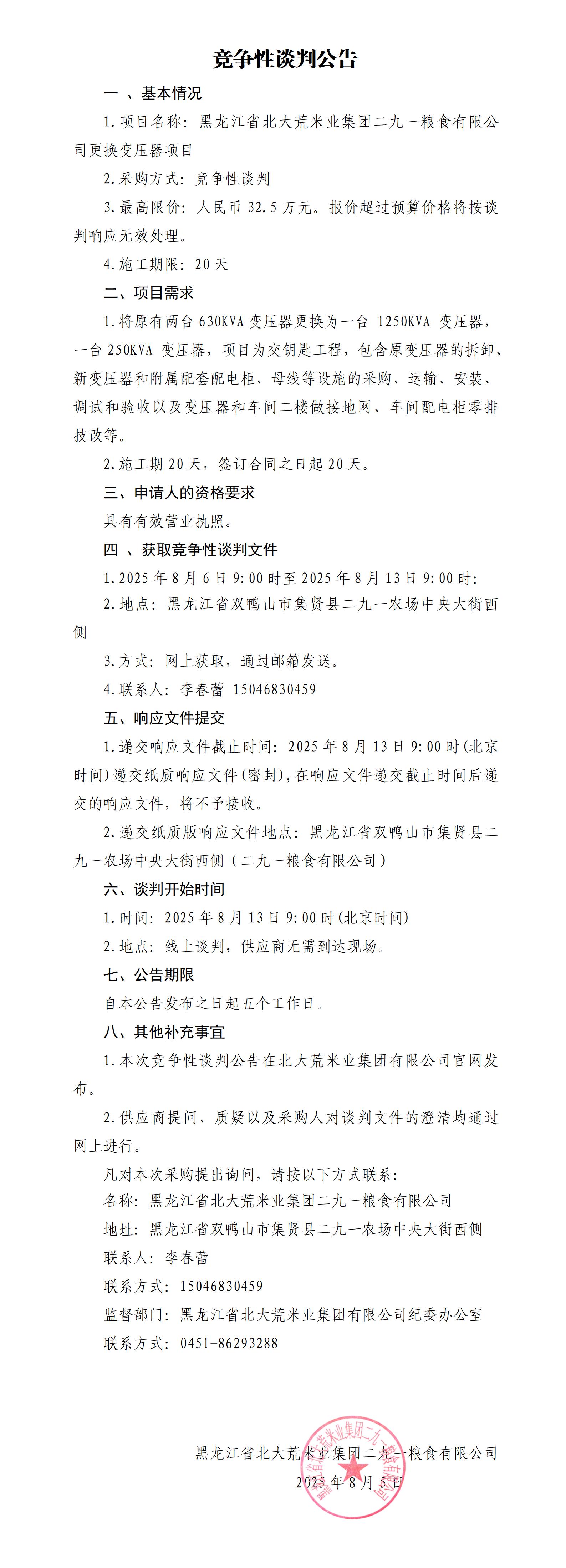 :黑龍江省北大荒米業集團二九一糧食有限公司更換變壓器項目競爭性談判公告