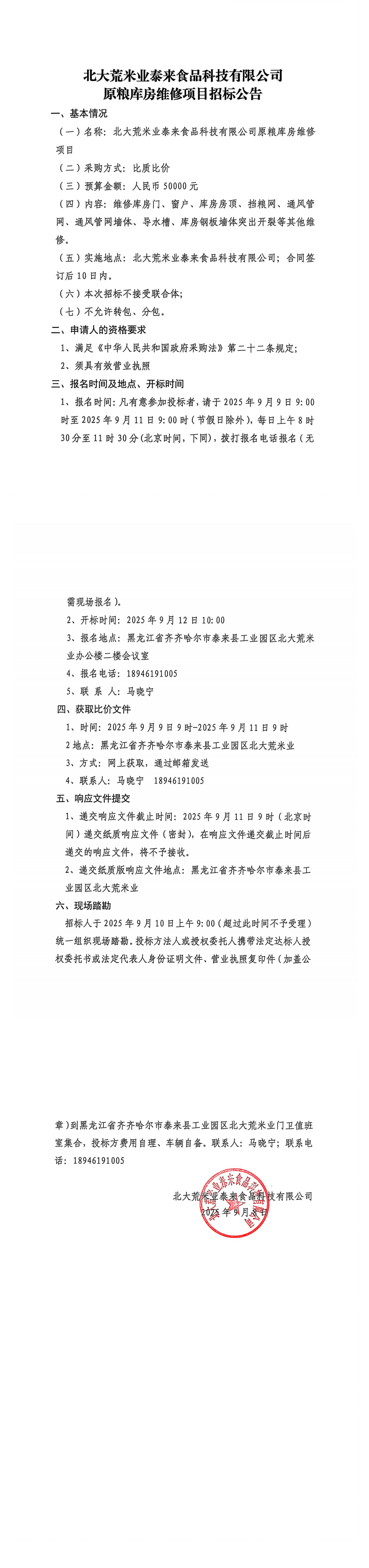 北大荒米業泰來食品科技有限公司原糧庫房維修項目