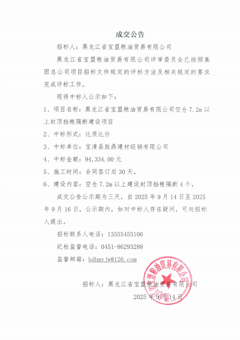 寶盟糧油貿易有限公司空倉7.2m以上封頂擋糧隔斷建設項目中標公告