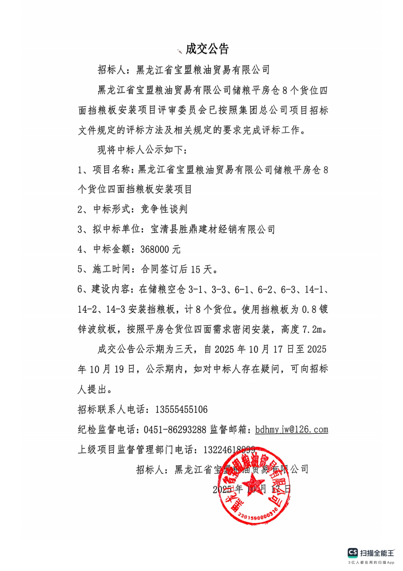 寶盟糧油貿(mào)易有限公司儲糧平房倉8個貨位四面擋糧板安裝項目成交公告