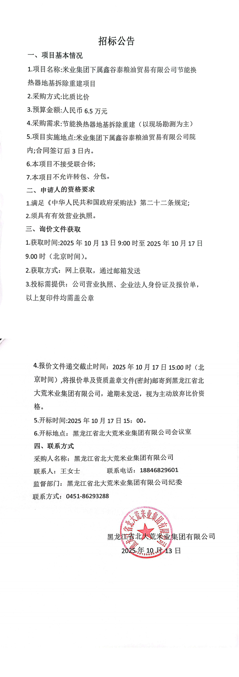 米業集團下屬鑫谷泰糧油貿易有限公司節能換熱器地基拆除重建項目采購公告