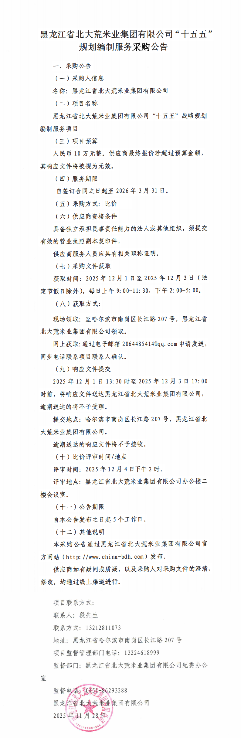 黑龍江省北大荒米業(yè)集團(tuán)有限公司“十五五”規(guī)劃編制服務(wù)采購(gòu)公告