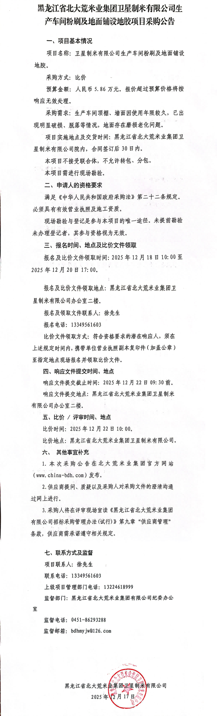 衛星制米有限公司生產車間粉刷及地面鋪設地膠項目采購公告